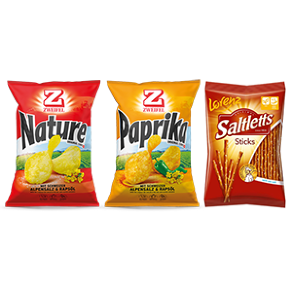 Chips Nature, chips Paprika, Saltletts Sticks Moins