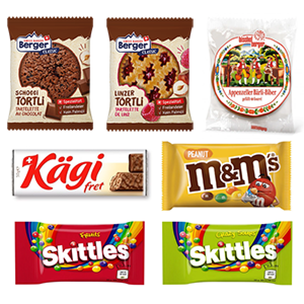 Petits gâteaux au chocolat, petits gâteaux de Linz, biscuits Biberli, Kägi Fret, M&M's, Skittles fruits, Skittles acidulés Moins