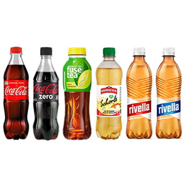 Coca Cola, Cola Zero, FuseTea, Jus de pommes léger et pétillant, Rivella Rouge, Rivella Bleu Moins